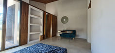 Constructed with sustainable materials like fluted metal sheets and projected cork, the design offers a natural aesthetic and efficient water drainage. Glazed surfaces with wooden shutters provide warmth and filter sunlight, creating a seamless connection between indoor and outdoor spaces.